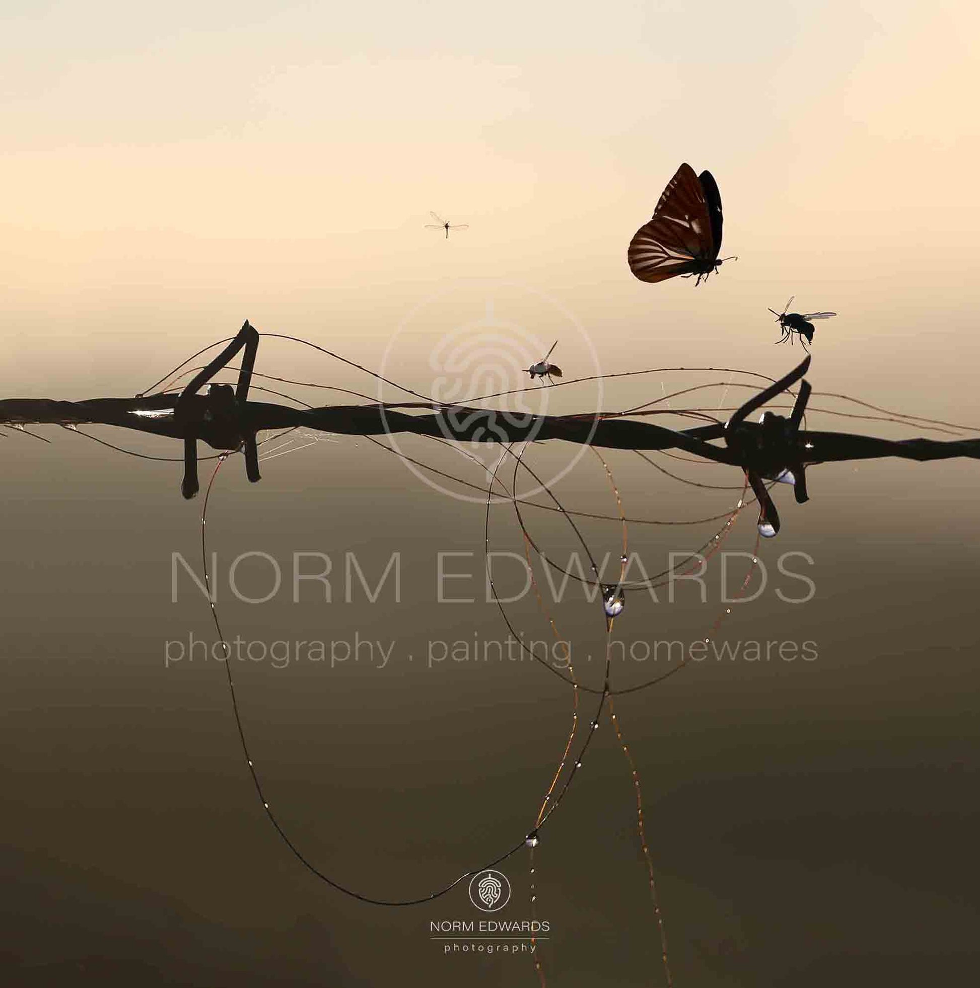 A small butterfly, wings partially open, is captured mid-flight near the wire, accompanied by a few tiny flying insects, frozen in motion. The contrast between the harsh, twisted barbed wire and the gentle fragility of the insects and droplets creates a compelling juxtaposition of nature and manmade intrusion.