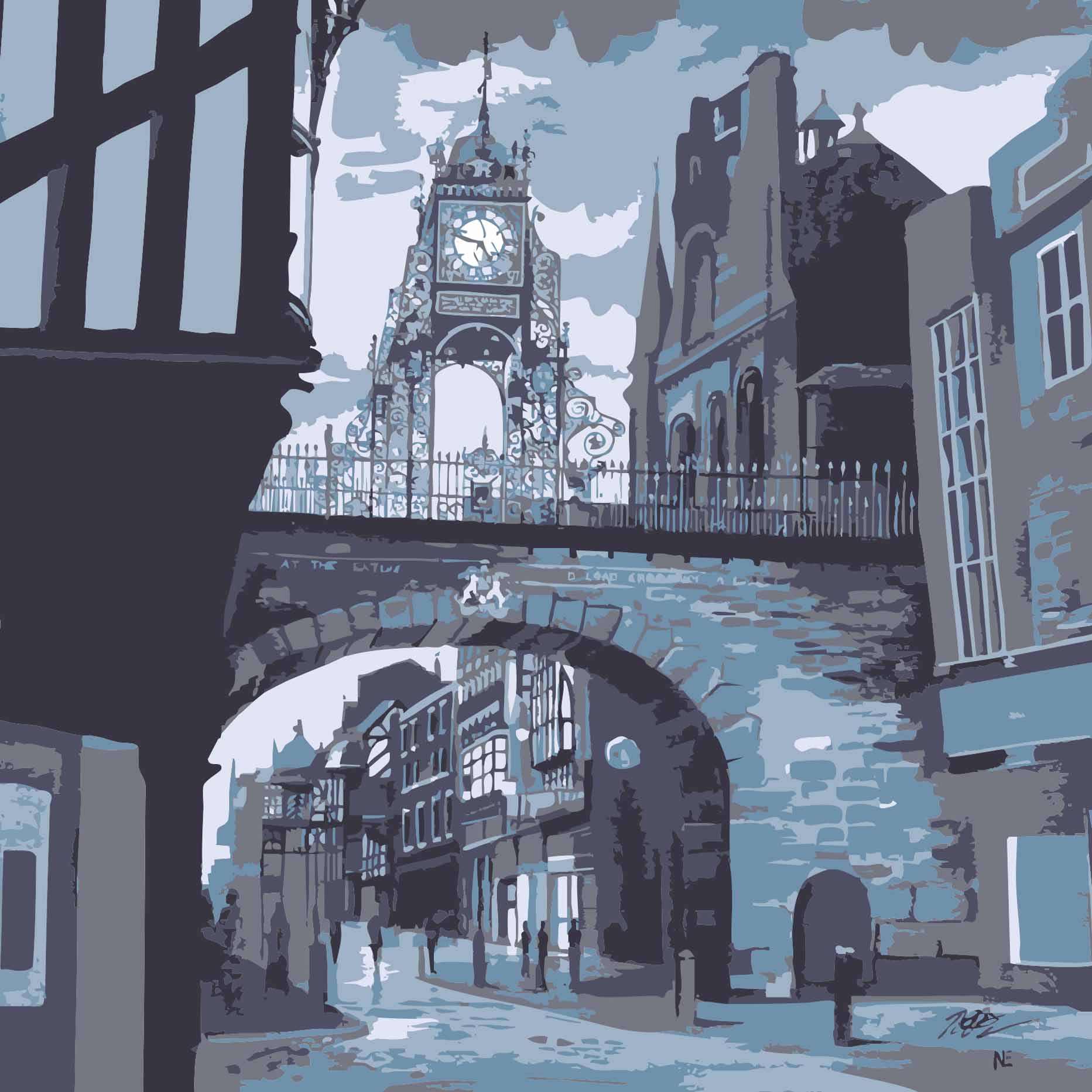 A unique blue / grey tonal variant of the original acrylic painting capturing the iconic Eastgate Clock in Chester, one of the most photographed timepieces in the UK. The artwork beautifully conveys the charm and history of this historic city. Set under a moody, atmospheric sky, the clock sits atop the ancient sandstone archway of Eastgate, glowing with soft, inviting light. The piece is individually numbered and produced using high-quality archival materials to preserve the depth and detail of the original work.